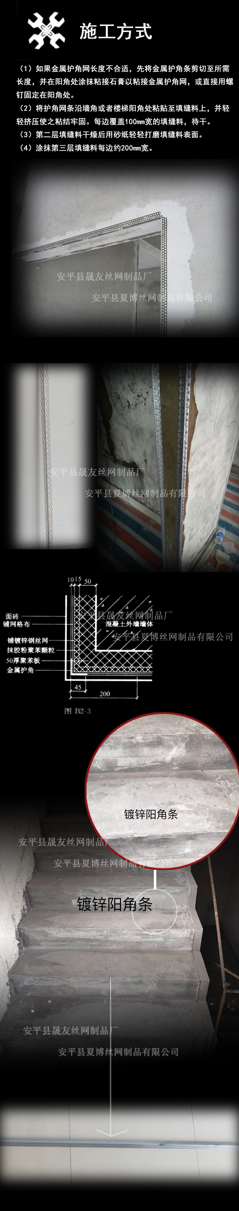 (1)如果樓梯護角網長度不合適,先將金屬護角條剪切至所需長度,并在樓梯陽角處涂抹粘接石膏以粘接梯護角網,或直接用螺釘固定在陽角處。